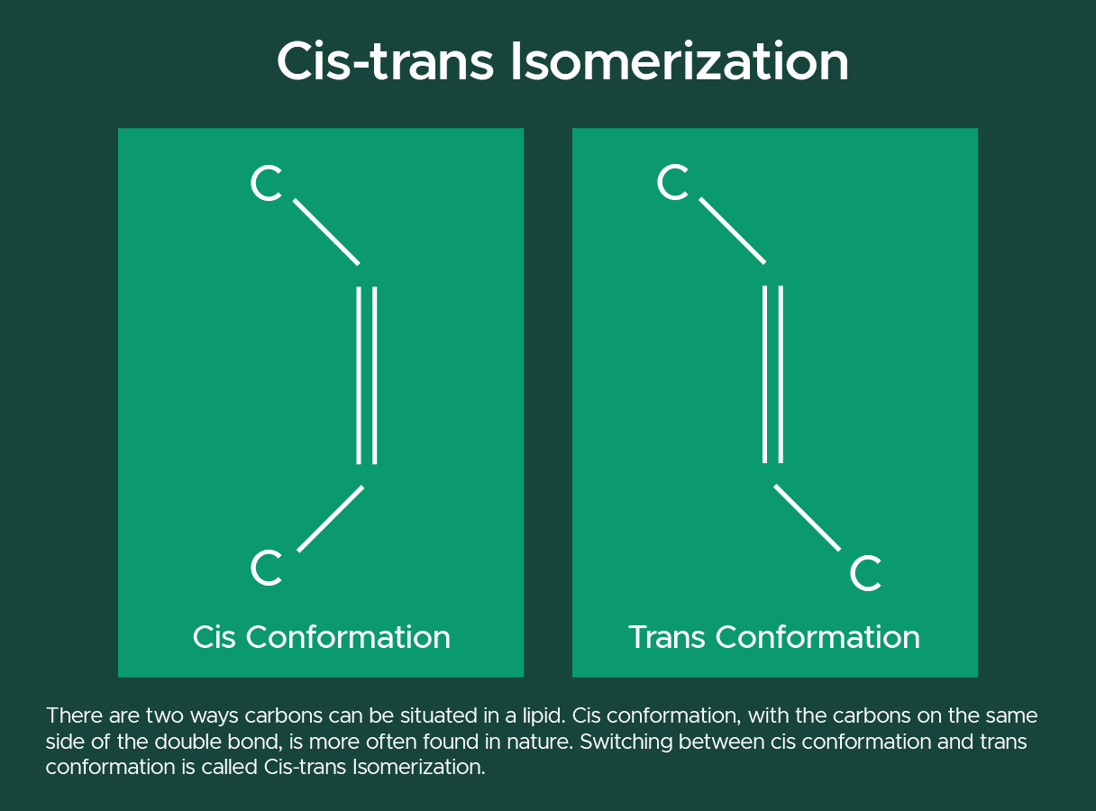 However, in trans conformation, it’s more difficult for things to pass through the membrane. Only some of the bonds need to switch to trans for this to happen. This switch is called cis-trans isomerization.